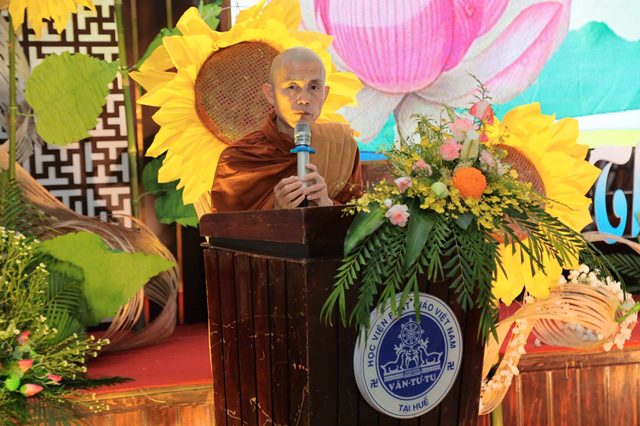 Tiếp đó, TT.Thích Minh Thuận đã thay mặt phái đoàn phát biểu, Thượng tọa bày tỏ niềm hoan hỷ khi lần đầu tiên được đến thăm Học viện Phật giáo Việt Nam tại Huế – một môi trường đào tạo rất trong lành, thanh tịnh, cách xa đô thị, tạo điều kiện thuận lợi cho hành giả an trú tu học và phát triển trí tuệ. Thượng tọa tán dương mô hình đào tạo của Học viện, đồng thời khuyến khích Tăng Ni sinh nỗ lực trau dồi tri thức, hướng đến việc học lên bậc Tiến sĩ để góp phần nâng cao trình độ học thuật Phật giáo Việt Nam. Bên cạnh đó, Thượng tọa nhấn mạnh tầm quan trọng của ngoại ngữ trong thời đại hội nhập, xem đây là hành trang thiết yếu để Tăng Ni sinh có thể giao lưu, học hỏi và truyền bá Phật pháp đến bạn bè quốc tế.