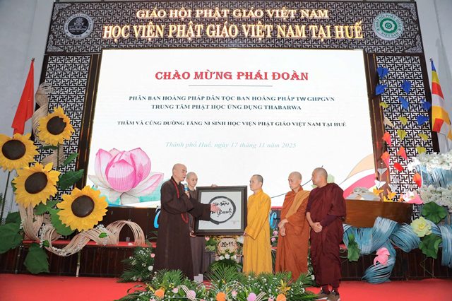 Khép lại buổi gặp gỡ, đại diện phái đoàn Phân ban Hoằng pháp Dân tộc – Ban Hoằng pháp TW GHPGVN và Trung tâm Phật học Ứng dụng Thabarwa đã trang nghiêm dâng tặng phần quà cúng dường đến Học viện Phật giáo Việt Nam tại Huế như một lời tri ân và trợ duyên cho công tác đào tạo Tăng tài. Đáp lại tấm lòng cao quý ấy, Hội đồng Điều hành Học viện cũng gửi tặng quà lưu niệm đến phái đoàn, thể hiện tình pháp lữ thâm tình và sự trân trọng đối với thiện tâm phụng sự của quý đại biểu.